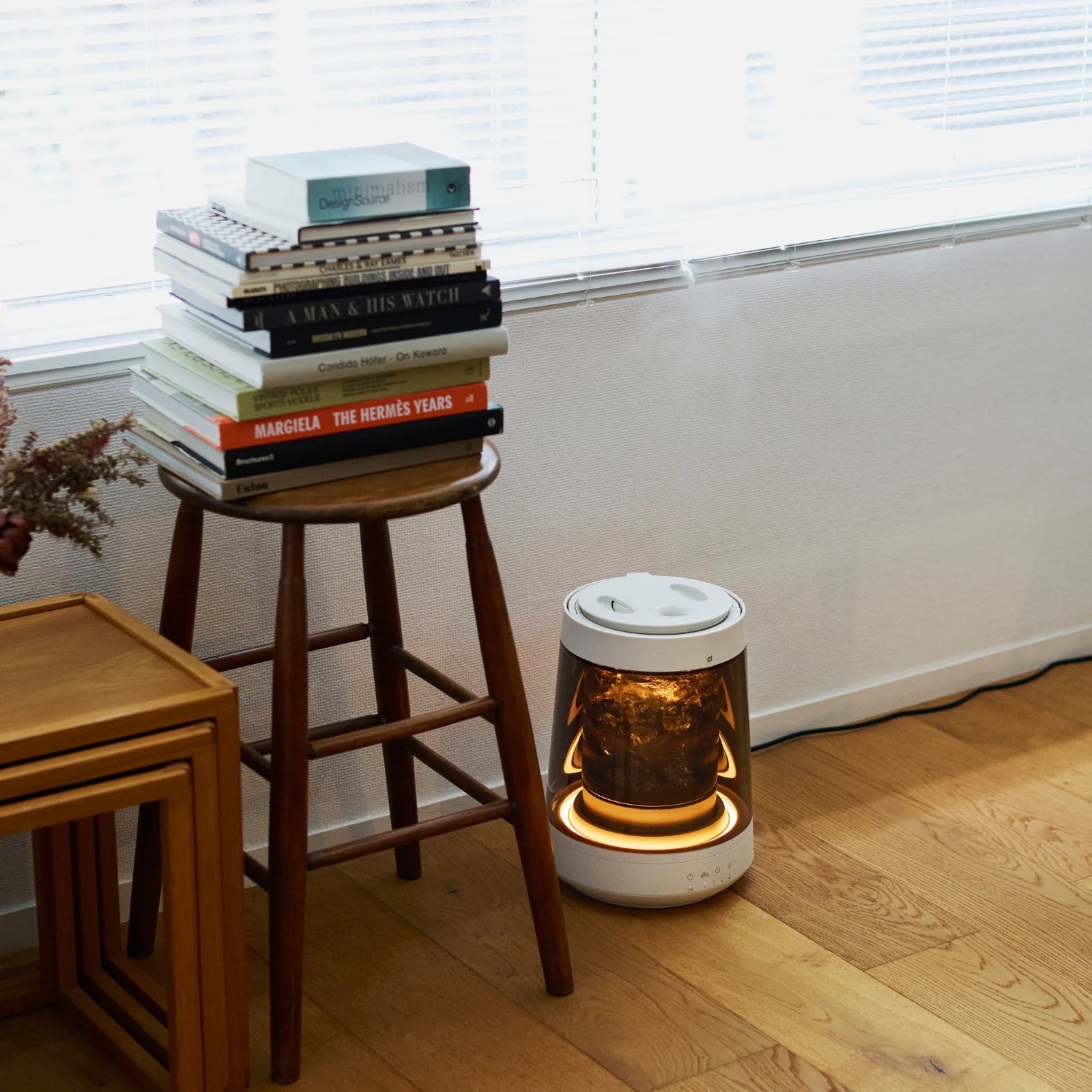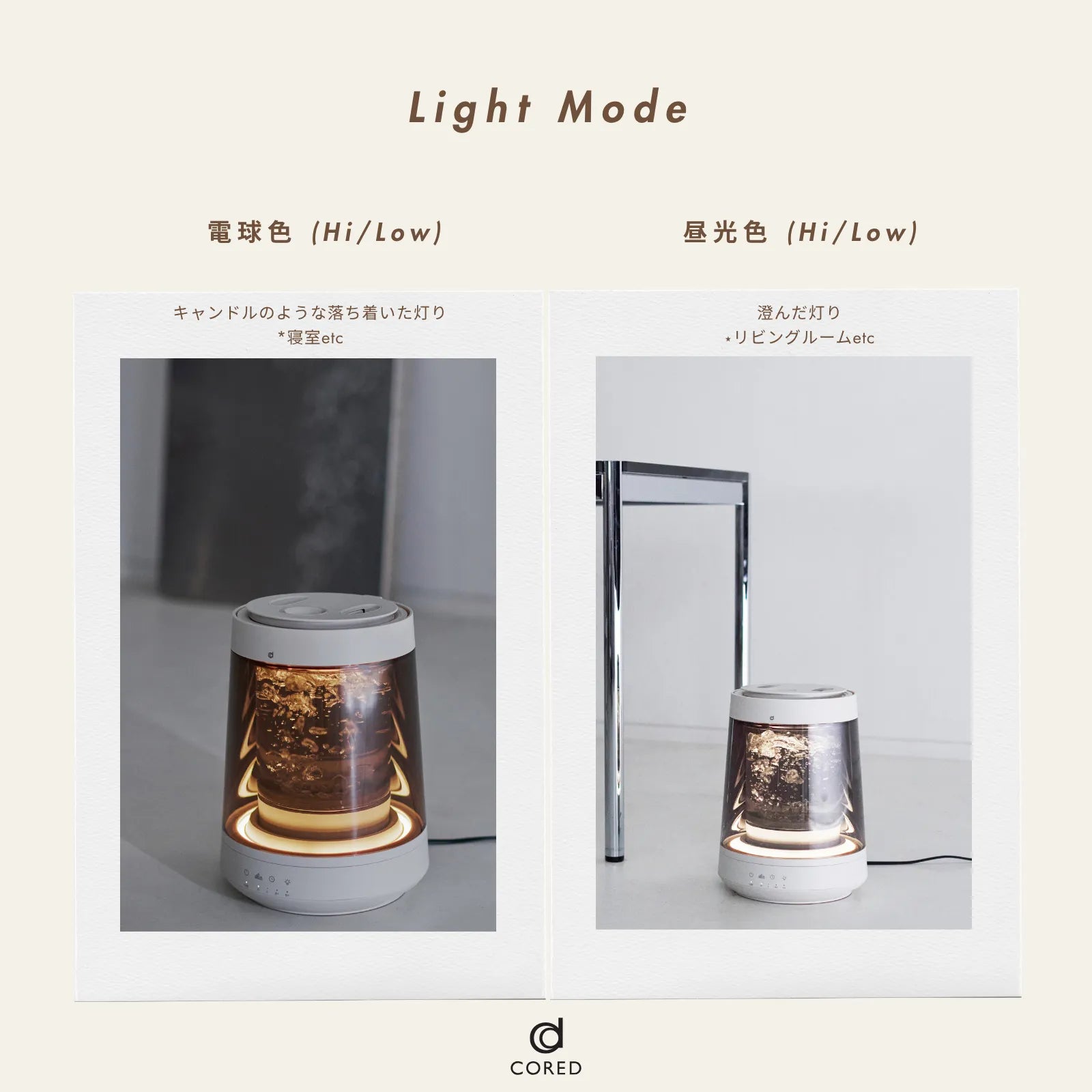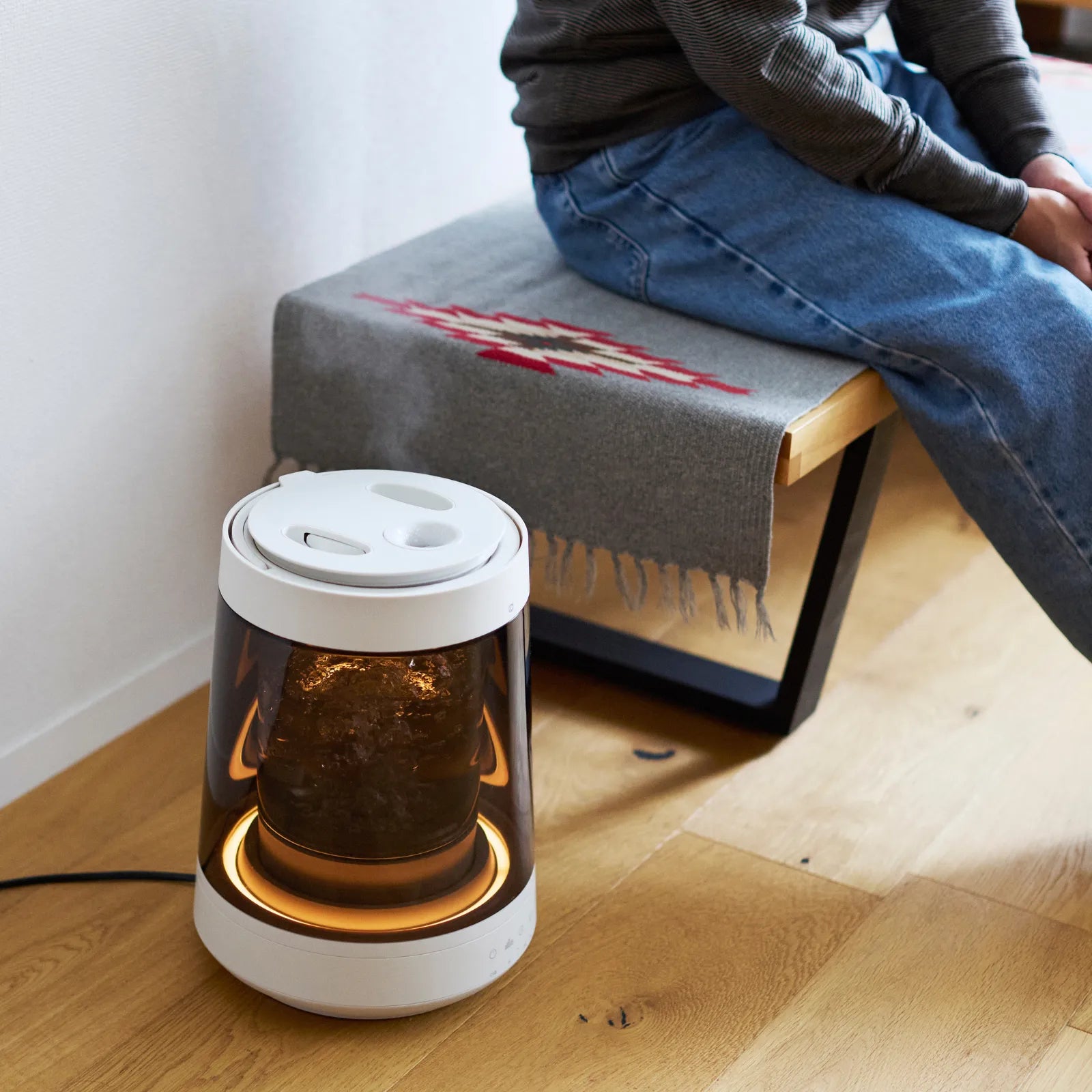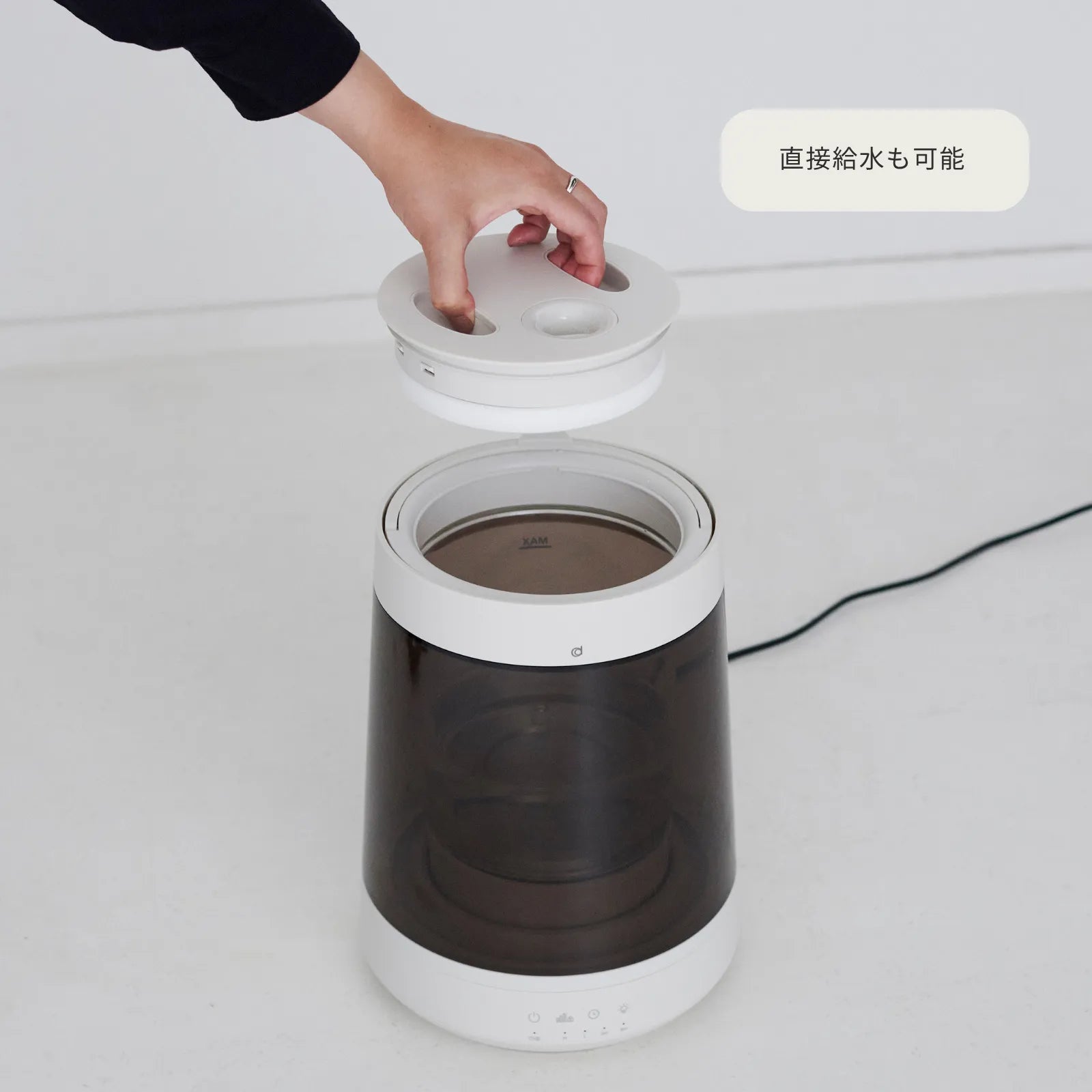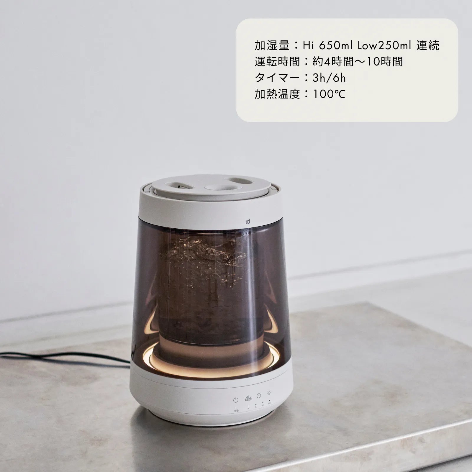 沸騰した水から生まれるピュアなスチームが、空気をやさしく潤します。4段階の照明モードが水の動きと呼応し、空間を穏やかに照らします。癒しと清潔さを両立した、インテリアのように美しいスチーム加湿器です。